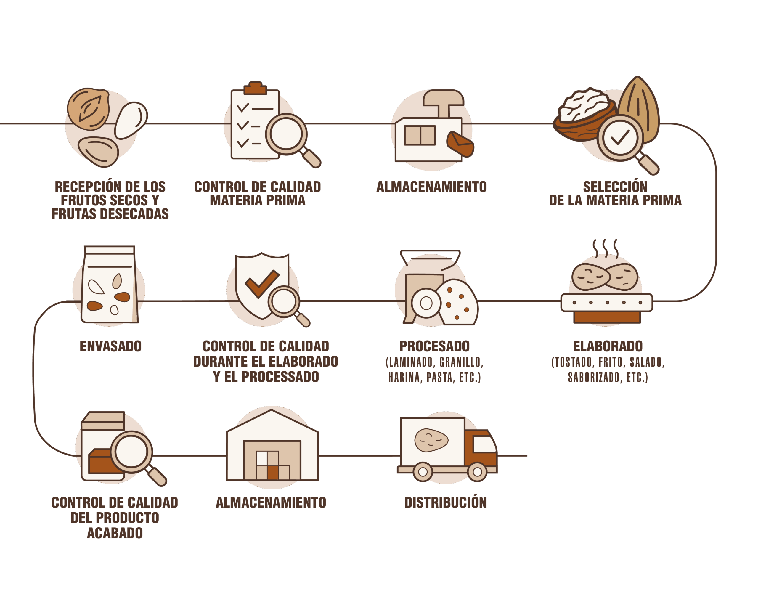 El proceso productivo de los frutos secos es complejo ya que existe un elevado componente tecnológico que resulta clave para poder obtener un producto de alta calidad y optimizar la capacidad de transformación en términos de coste y tiempo. Los estrictos controles de calidad de Borges BAIN aseguran la trazabilidad y seguridad alimentarias en todas las fases del proceso productivo.